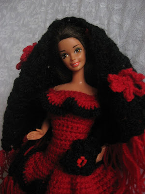 w kruczoczarne włosy ma wpięty czerwony kwiat.